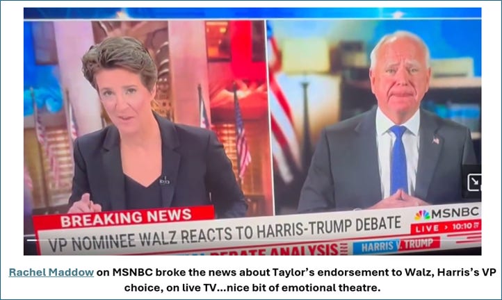 Harris’s running mate, Tim Walz reacted to the endorsement in real time on air with MSNBC’s Rachel Maddow. Walz put his hand to his heart, moved, when Maddow read out Swift’s pledge to vote for the ticket in 2024, and smiled through her reading of the caption, mouthing, “Wow, wow!” when she finished, then saying, “All those things I am incredibly grateful, first of all, to Taylor Swift. I say that also as a cat owner, a fellow cat owner.”