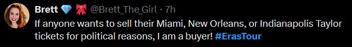 An upside for some Swifties is that any Republican-leaning Swift fans might feel like selling their tickets to her tour, in which case there will be room for more of her devoted fans.