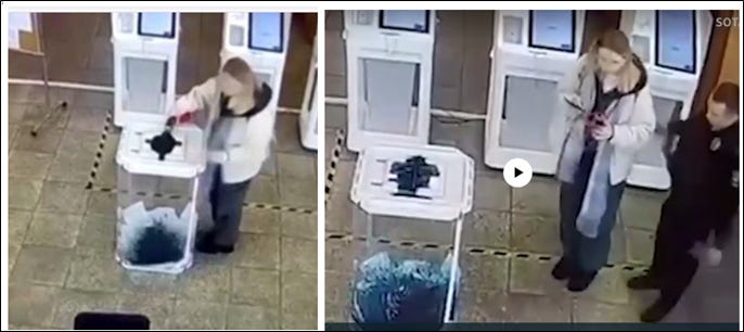 Four others followed her example and poured dye or ink into ballot boxes in the Russian regions of Voronezh, Karachay-Cherkessia and Rostov. The substance was a green antiseptic dye known as “zelyonka”. It is a brilliant green in color, and its antiseptic properties make it dangerous to eyesight. One of Putin’s agents once threw it in the face of Alexei Navalny, Putin’s foe who was killed just before the election started.