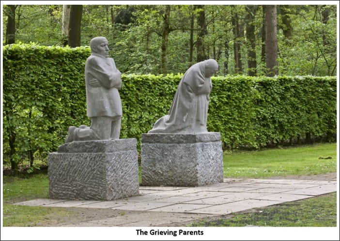 The universality of the pain of war is perhaps symbolized best, according to RH, by a sculpture created by Käthe Kollwitz, the mother of a son who was killed in 1914, in the opening month of the First World War. Called the “Grieving Parents”, the stone figures depict a father with his arms wrapped around his chest, bearing down on the sorrow that threatens him from within. The woman is bowed by pain. The statue is replicated in many graveyards, for the dead of many wars. Kollwitz’ grandson was killed in 1941 fighting in Russia. She herself died in the Spring of 1945, just before Germany’s surrender. She said that war had followed her for her entire life.