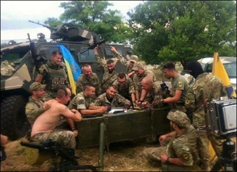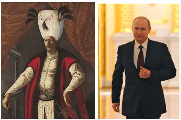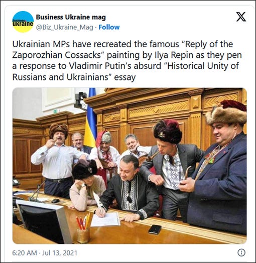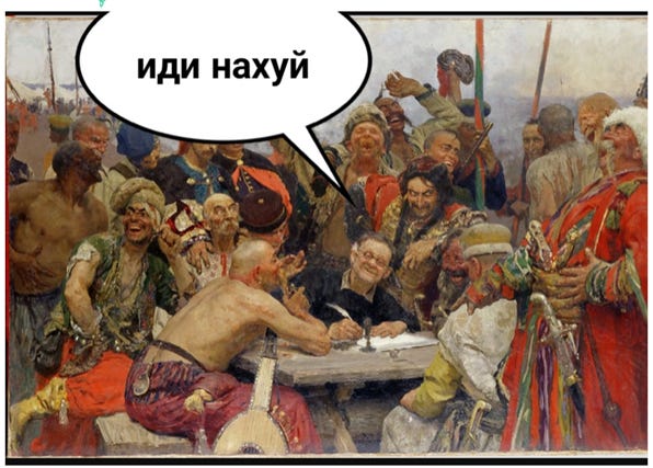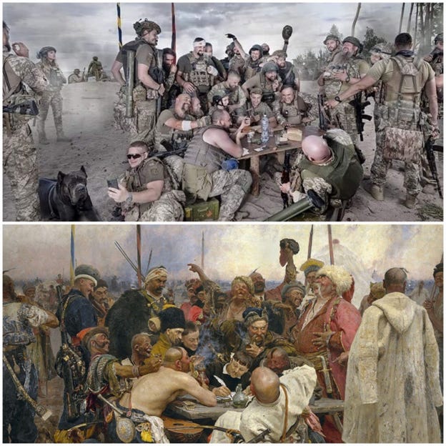 The Ukrainian soldiers who are recreating the painting are of course snubbing their nose at a different tyrant — not an Ottoman Sultan but a Russian Tsar-Imitator. There is no doubt that the folks represented in the original painting would nod approvingly at the sentiments in the new photo.