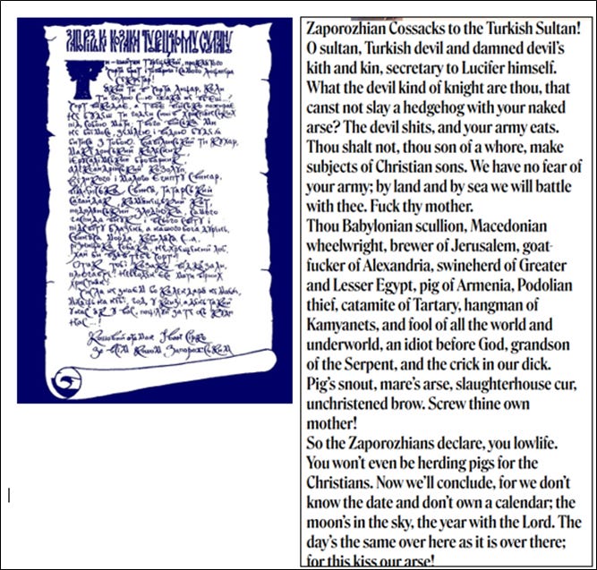 The Zaporozhian Cossacks (from “beyond the rapids”), lived around the lower Dnieper River in Ukraine. They had just defeated Ottoman Empire forces in battle. However, despite his army having suffered this loss to them, Mehmed demanded that the Cossacks submit to Ottoman rule. The Cossacks, led by Ivan Sirko, replied in a characteristic manner: they wrote a letter, replete with insults and profanities (words below).