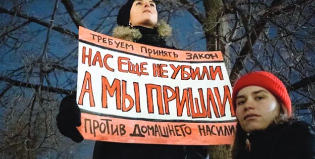 In the heady days of 2019, a protester carries a sign that reads: “We demand a law against domestic violence. We are not killed yet, but we're close.”